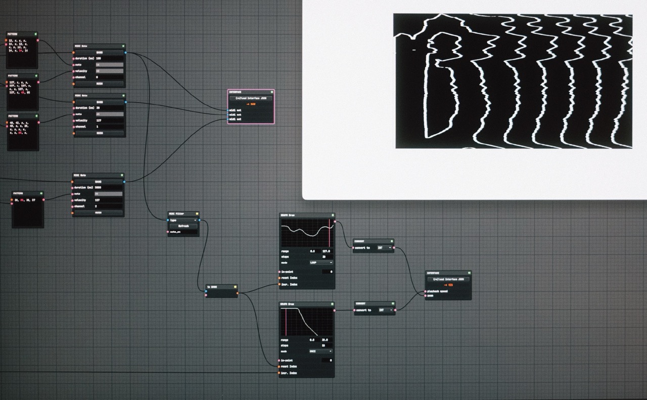 An audioreactive visual system where NODESTROM handles the interpretation logic of MIDI signals for the visualizer.