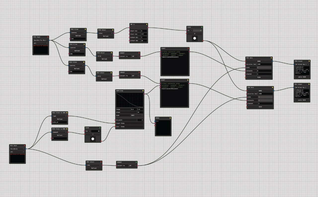 A single keystroke is received from the MIDI controller and distributed across multiple instruments via NODESTROM. This simultaneously produces arpeggiated patterns and drone sounds. The arpeggiator pattern can be drawn by hand in the Graph Draw node. The system outputs only whole tones (no semitones).